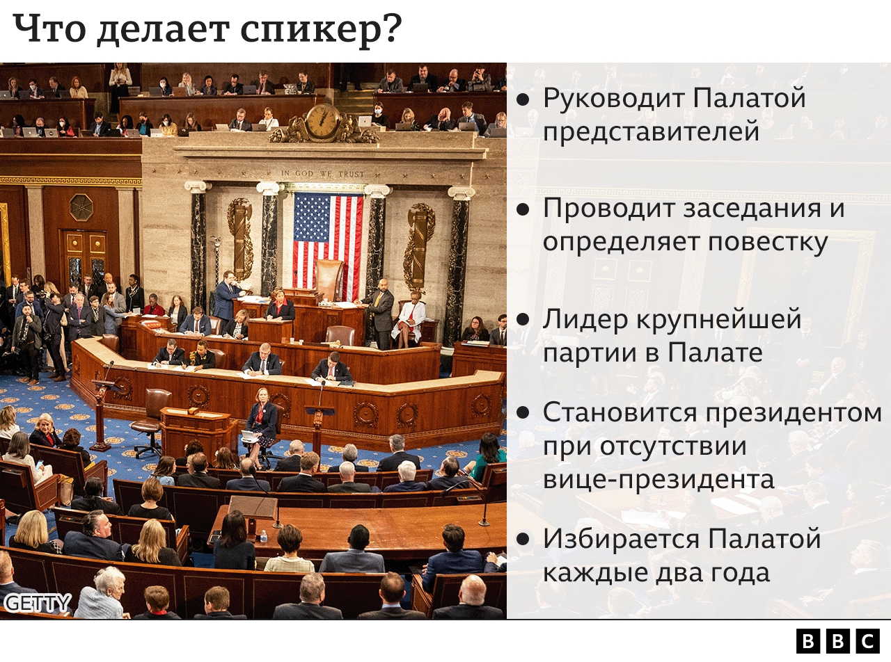 Спикер Палаты представителей — это должность в Конгрессе, указанная в Конституции США. После вице-президента он является следующим в очереди на пост президента.