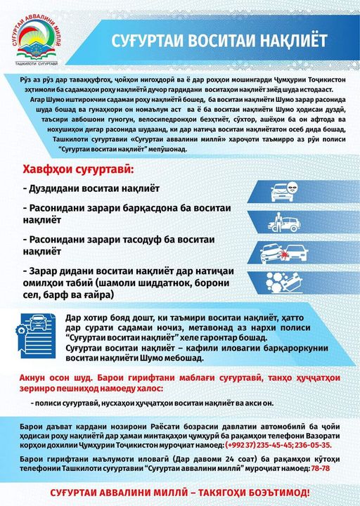 Выяснилось, что при получении страхового полиса им никто не объясняет условия страхования. Размер взноса на обязательное страхование гражданско-правовой ответственности владельцев транспортных средств (ОСАГО) до 2020 года составлял 147 сомони, а максимальная сумма ущерба – около 9 тысяч сомони.