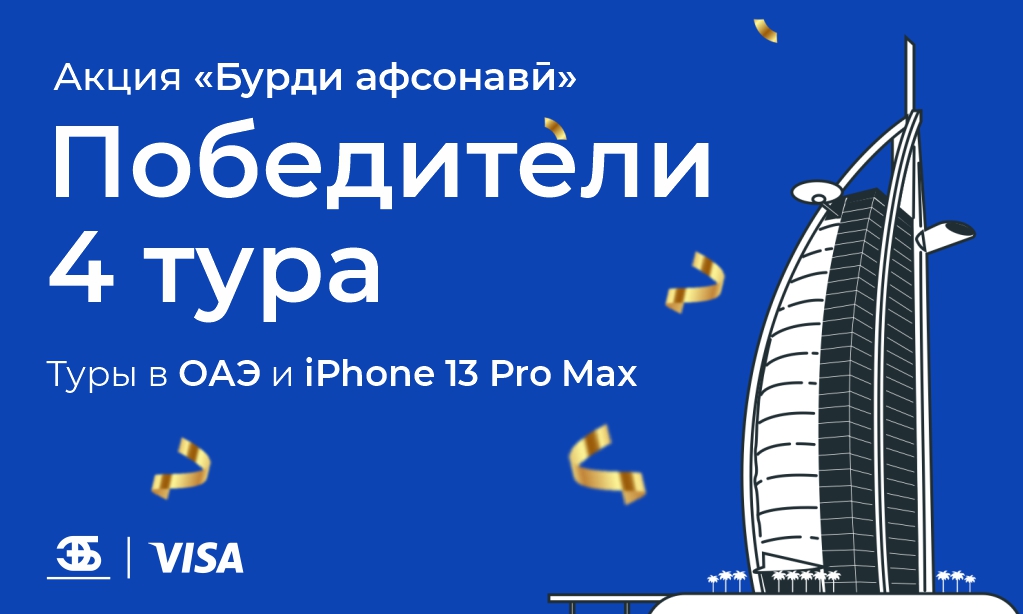 Напоминаем, что с 09.09.2022 по 31.12.2022 года Банк Эсхата провел акцию «Бурди афсонави». В рамках акции клиенты, оплатившие картой VISA Банка Эсхата в точках торговли и услуг с помощью QR или POS терминала, а также совершившие покупки в интернет-магазинах, используя карту VISA на сумму не менее 100 сомони получили купоны участника акции и приобрели возможность выигрыша туров на двоих в зарубежные страны, а также смартфонов iPhone 13 Pro Max.