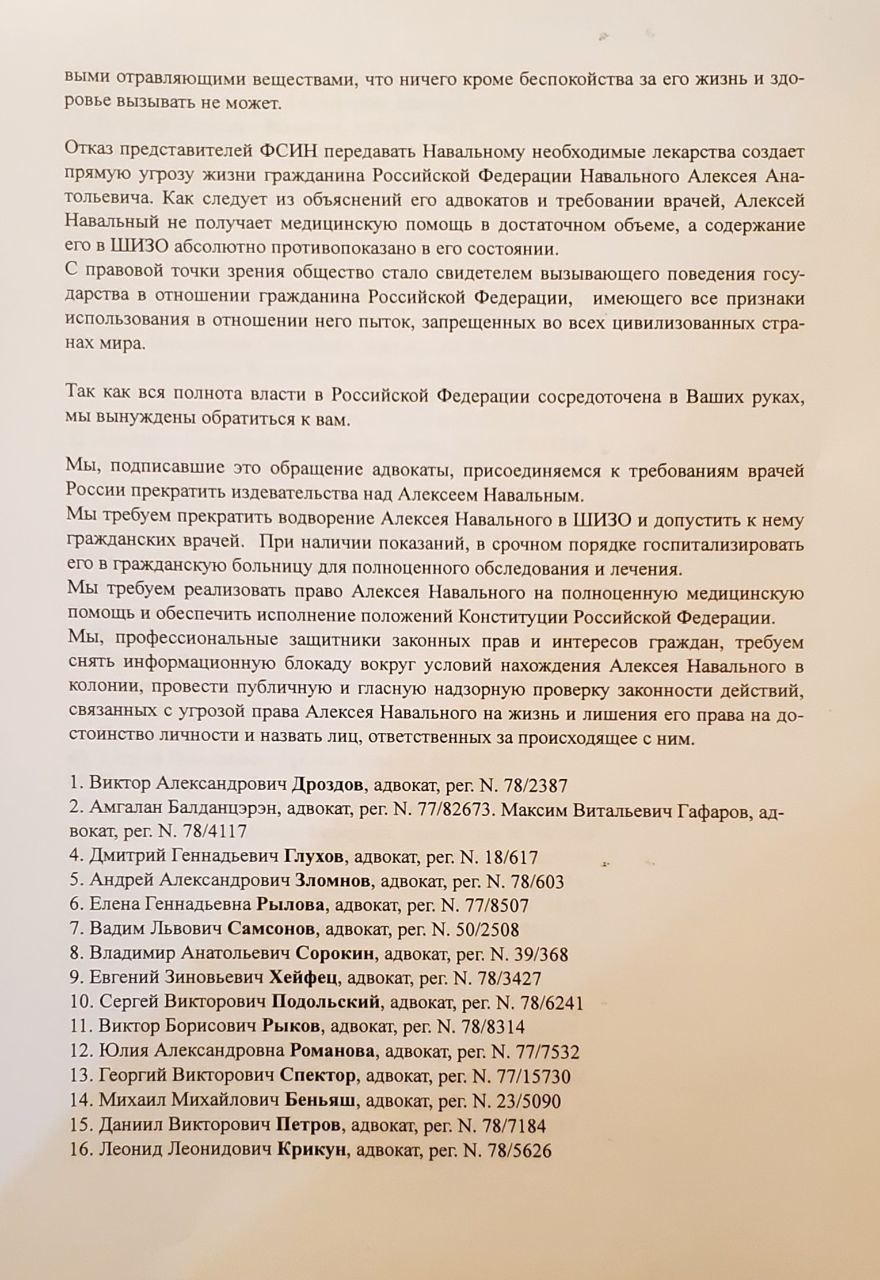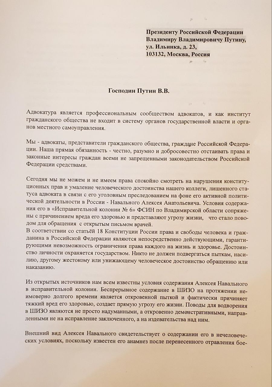 Между тем, 103 российских адвоката подписались под письмом к Путину с требованием прекратить издевательства в колонии над Алексеем Навальным.