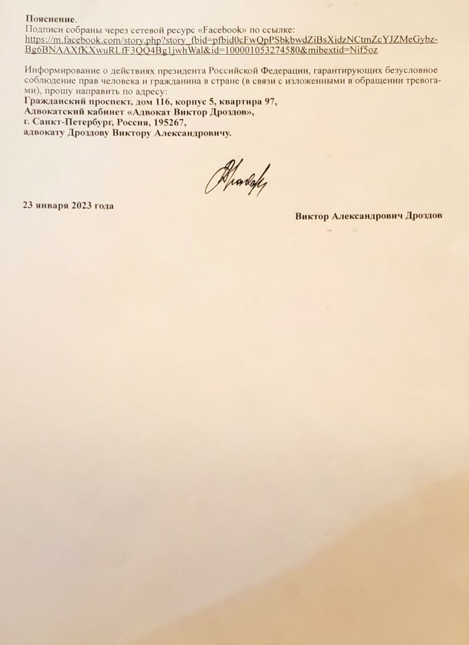 Сегодня инициатор письма, адвокат Виктор Дроздов, направил его в Администрацию президента.