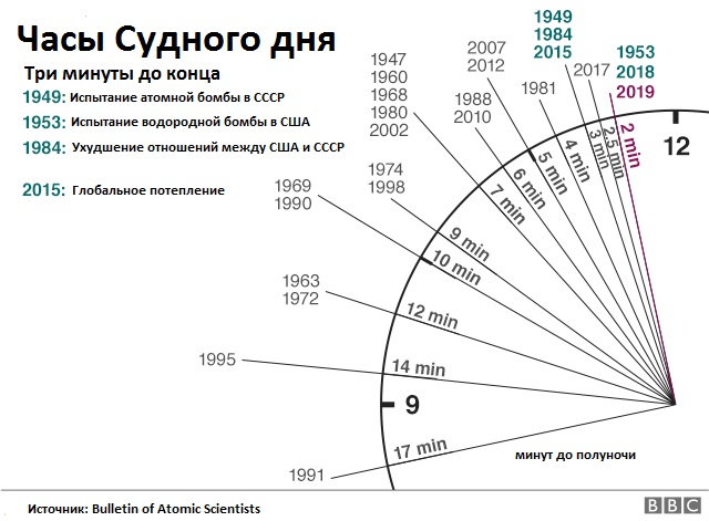 Часы Судного дня сдвинули на десять секунд и теперь стрелка показывает 90 секунд до полуночи — время беспрецедентной опасности, по словам ученых. Полночь на часах символизирует мировой ядерный катаклизм, и чем ближе стрелка, тем, по мнению экспертов-ядерщиков, мир ближе к катастрофе. Перемещение стрелки транслировали в прямом эфире в Вашингтоне во вторник, передает Би-би-си.