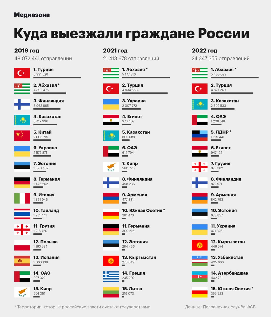 Как отмечает "Медиазона", также проанализировавшая статистику ФСБ, в 2022 году из России выехало больше граждан РФ, чем в 2021 году, когда еще действовали коронавирусные ограничения, но почти в два раза меньше, чем в обычный год без войны и ковида.