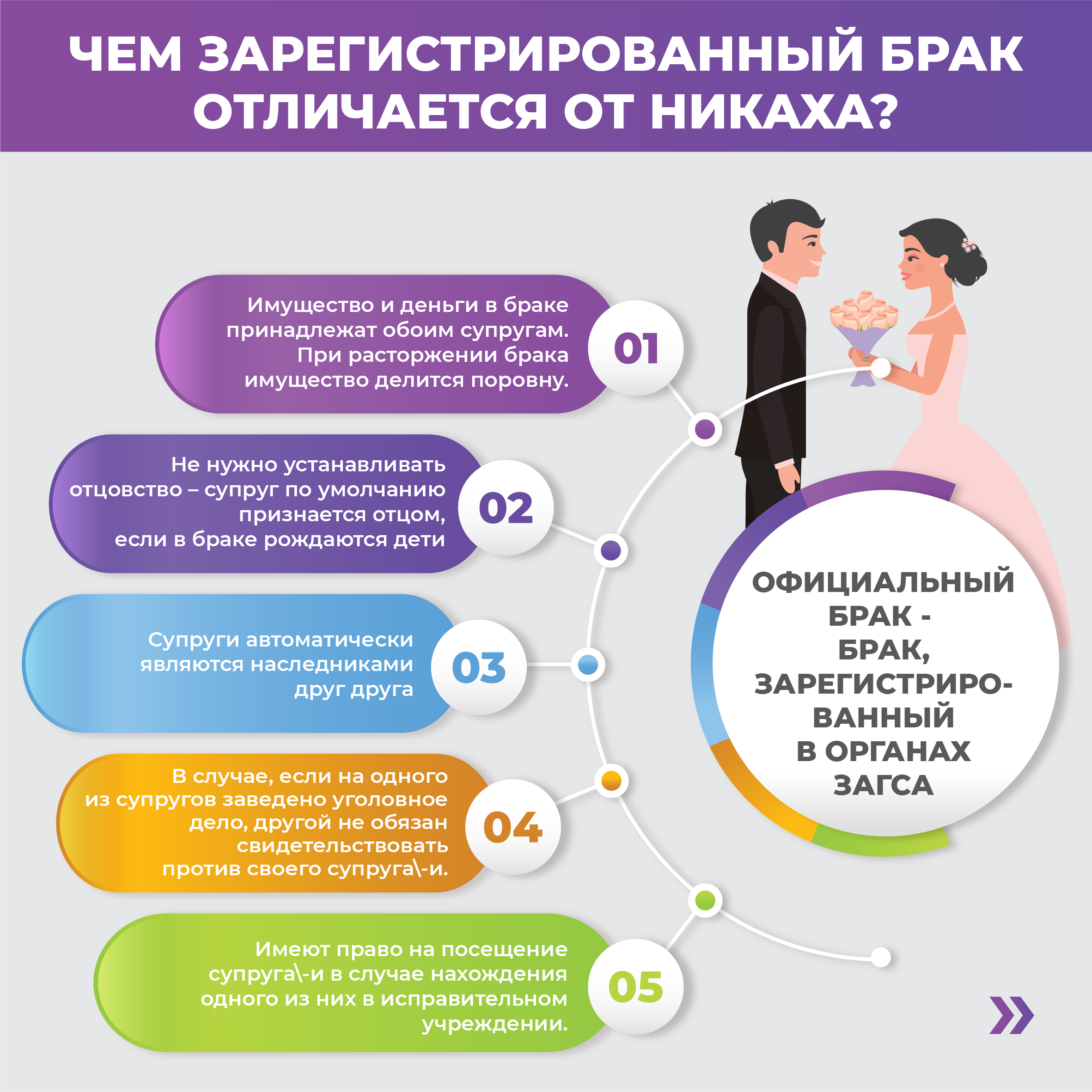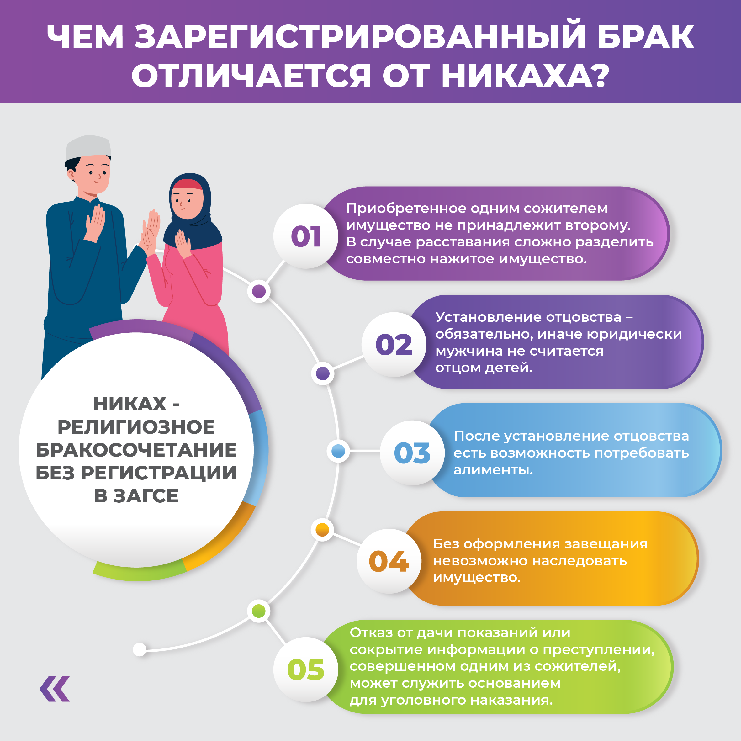 Согласно законодательству, браком признается только такой союз, который зарегистрирован в ЗАГСе. Таким образом, никох на законодательном уровне не считается официальным супружеством. Поэтому даже в случае совершения никох обязательно нужно зарегистрировать свои отношения в органах ЗАГСа.