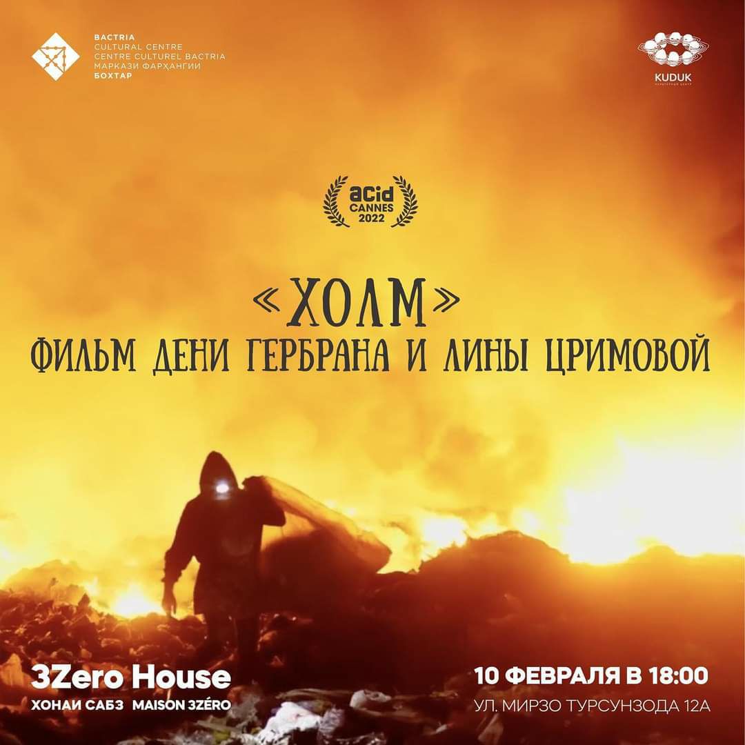 В пространстве 3Zero House Душанбе (Культурный Центр "Бактрия") 10 февраля в 18:00 состоится показ фильма "Холм" режиссеров Дени Гербрана и Лины Цримовой. Кинокартина на тему экологии была показана на Каннском фестивале.