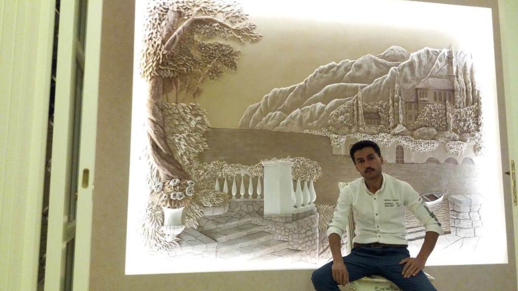 Принимая заказы, Фахриддин сначала предлагает подходящие эскизы, после согласования с заказчиком рисуется эскиз на стене и уже потом во всех деталях создается рельеф специальным инструментом под названием мастихин.