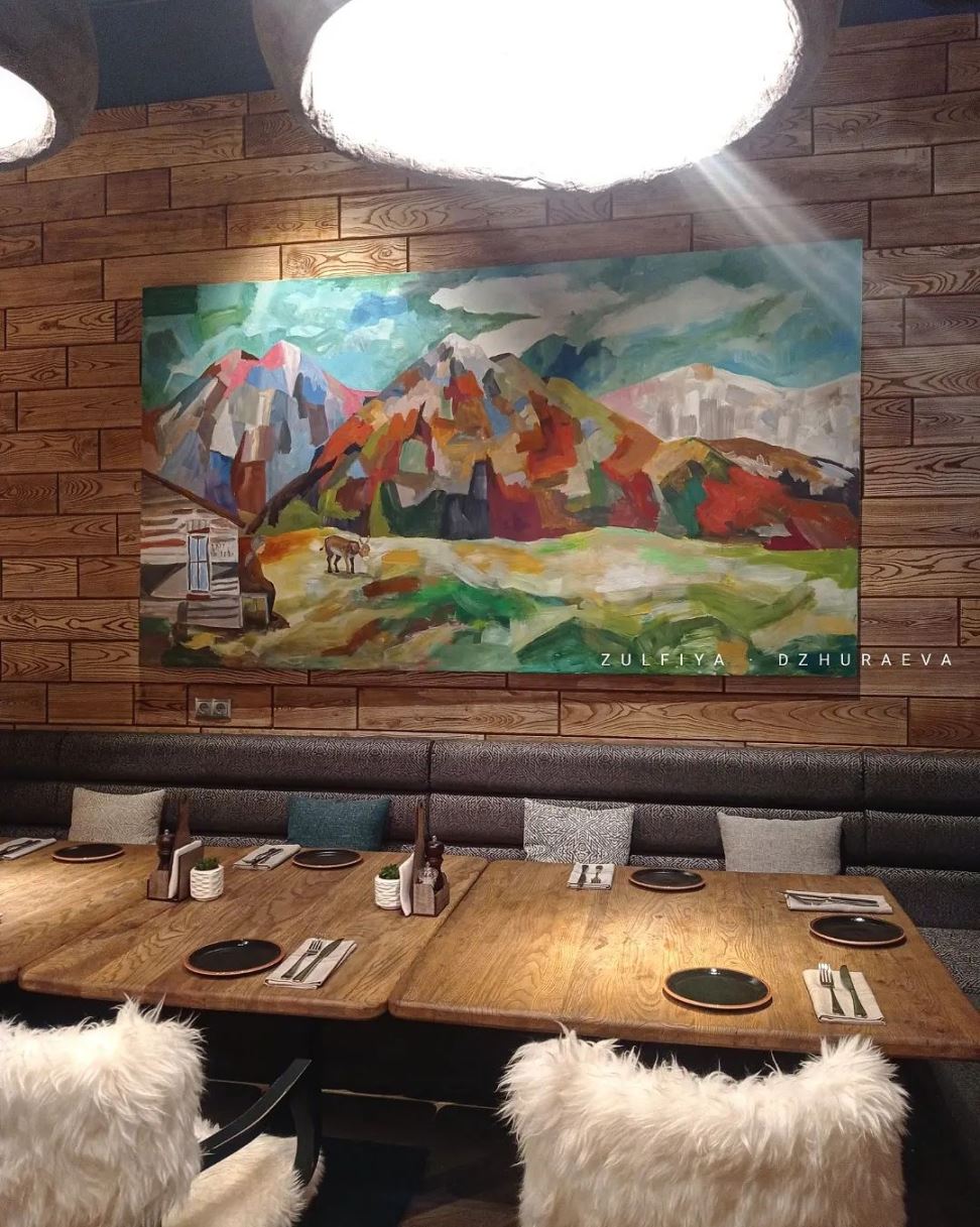— Я начала свою деятельность в сфере искусства ещё не окончив художественное училище, — рассказывает Зульфия. — Подрабатывала, рисуя настенную роспись. Мои работы можно увидеть во многих кафе. Затем после окончания архитектурного факультета, я решила работать в сфере интерьерного дизайна. Также я писала картины одновременно, так как был спрос на абстрактную живопись.