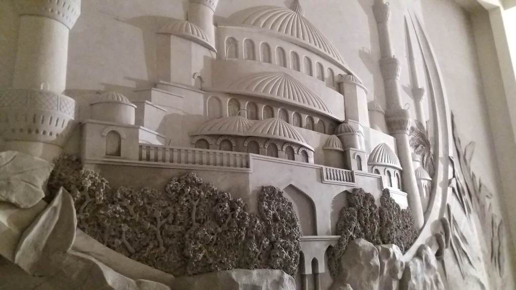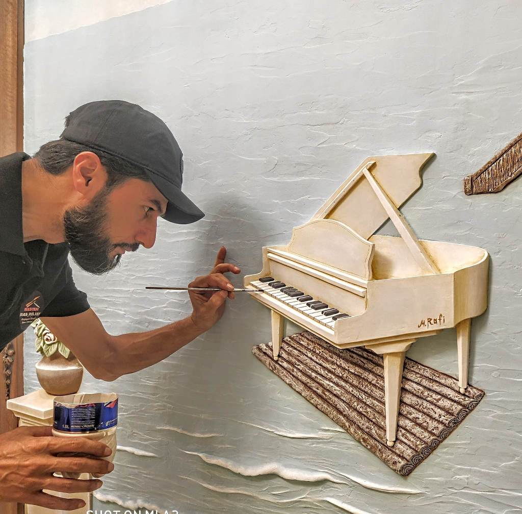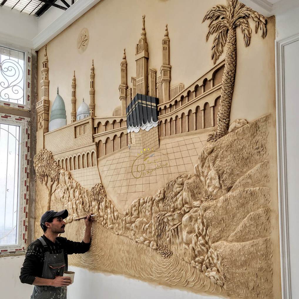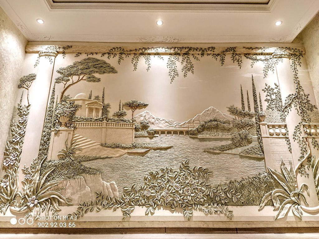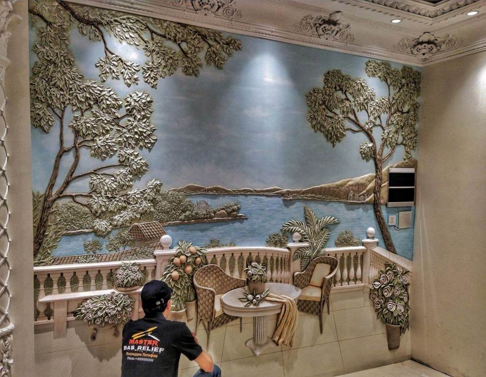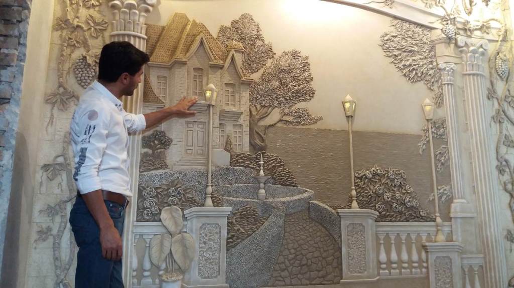Принимая заказы, Фахриддин сначала предлагает подходящие эскизы, после согласования с заказчиком рисуется эскиз на стене и уже потом во всех деталях создается рельеф специальным инструментом под названием мастихин.