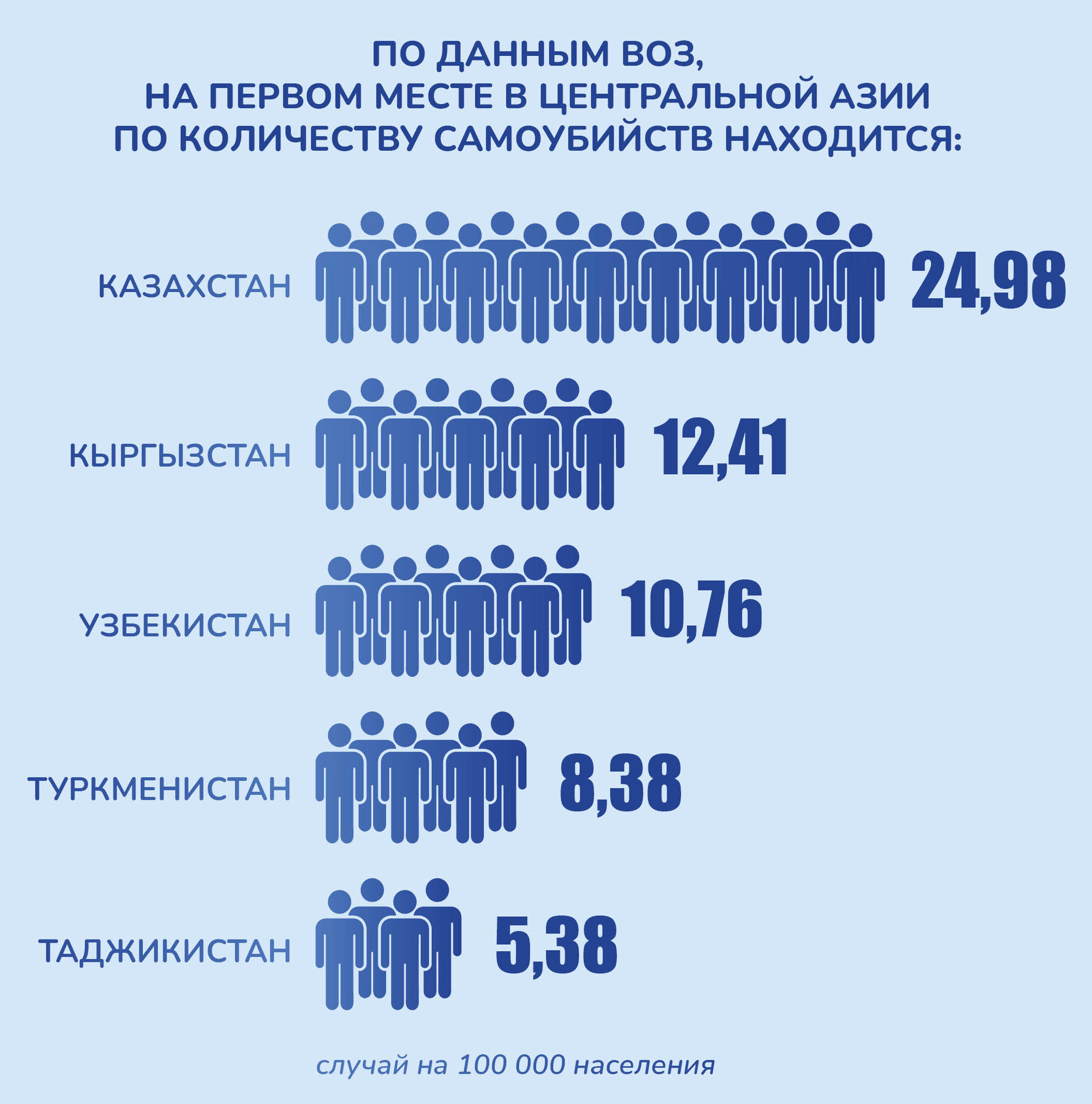 Сеитов рассказывает, что Узбекистан находится далеко не на первых местах в мировых рейтингах по количеству совершенных самоубийств: "В принципе, по данным ВОЗ, у нас около восьми случаев суицида на 100 тысяч человек (населения), поэтому, скажем так, мы не в топе".