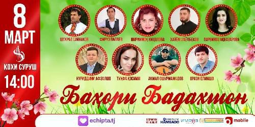 В столичном "Суруш Холле" 8 марта в 14:00 состоится концерт "Бахори Бадахшон" с участием звёзд таджикской эстрады: Шухрата Сайнакова, Парвиноз Акназаровой, Нуриддини Афзалшо, Таманно Алидодовой, Хаёма Хаёлбекова, Фируза Паллаева, Ширинмох Нихоловой, Тухфы Косими, Акмала Ошурмамадова и Орази Олимшо.