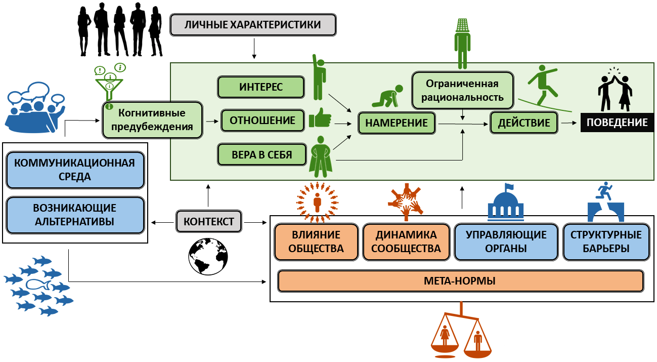 Каждый из этих факторов делится на соответствующие критерии, которые определяют и влияют на то или иное поведение человека для понимания того, почему люди поступают так, а не иначе, что является значимым для них в зависимости от разных личностных характеристик, семейных взаимоотношений, традиционных норм и стереотипов сообщества, существующих институциональных механизмов и для изменения их отношения.