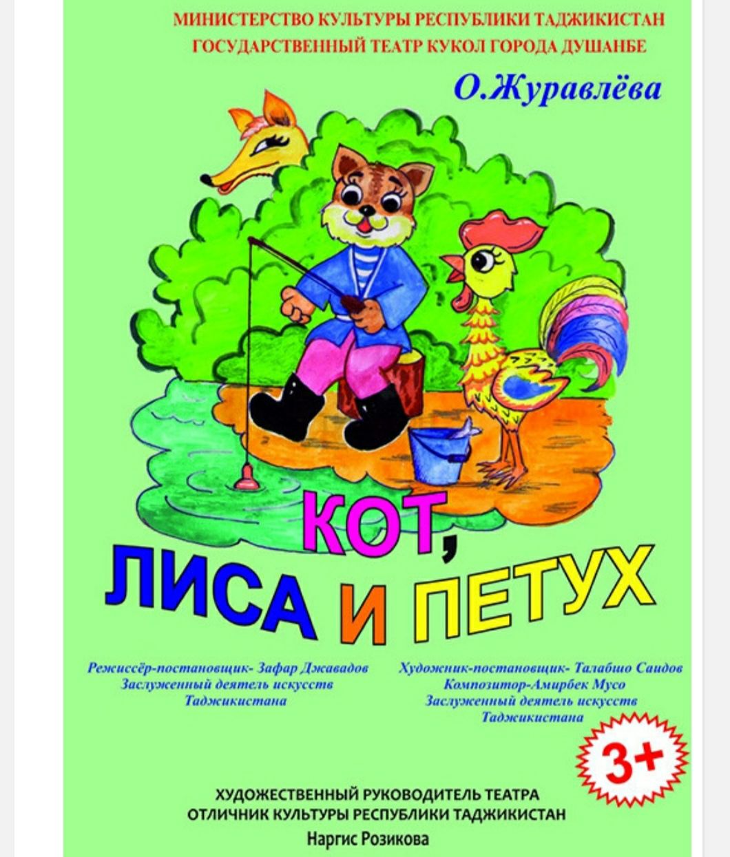 В таджикском театре кукол «Лухтак» города Душанбе 2 апреля в 11:00 состоится показ детского спектакля «Кот, лиса и петух» Ольги Журавлёвой, поставленный режиссёром Зафаром Джавадовым.