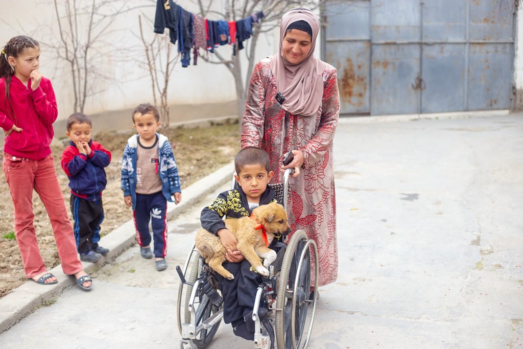 Тоже самое могу сказать о нашем маленьком герое – Зикрулло, у него «хрустальная болезнь», слабые кости, мальчик на коляске. Мы определили в их семью щенка, он назвал его Симба.
