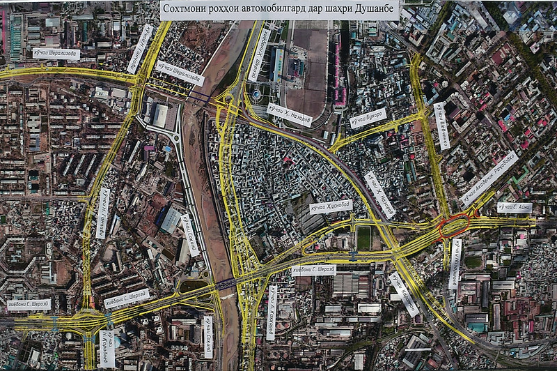 Двухуровневые дороги, согласно проекту, будут построены на пересечении улиц Сохили (Набережная) и Джануби (Южная) с мостовым переходом через реку "Душанбинка", на пересечении улиц Абдурахмони Джоми и Каххорова, на пересечении улиц Абая и Каххорова, на пересечении проспекта Саъди Шерози с проспектом Хофизи Шерози, а также появится двухуровневый переход с мостом на пересечении улиц Хабибулло Назарова и Шерализода.
