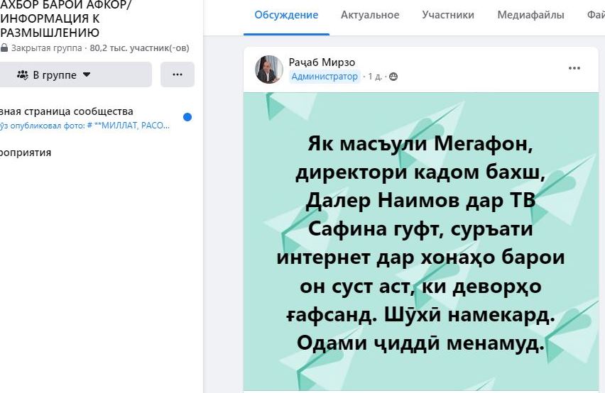 На днях журналист Раджаб Мирзо на странице группы «Ахбор барои афкор» («Информация к размышлению») в Facebook написал, что в одной передаче на местном телевидении представитель мобильной компании «Мегафон» сказал, что причина плохого интернета в жилых домах — толстые стены.