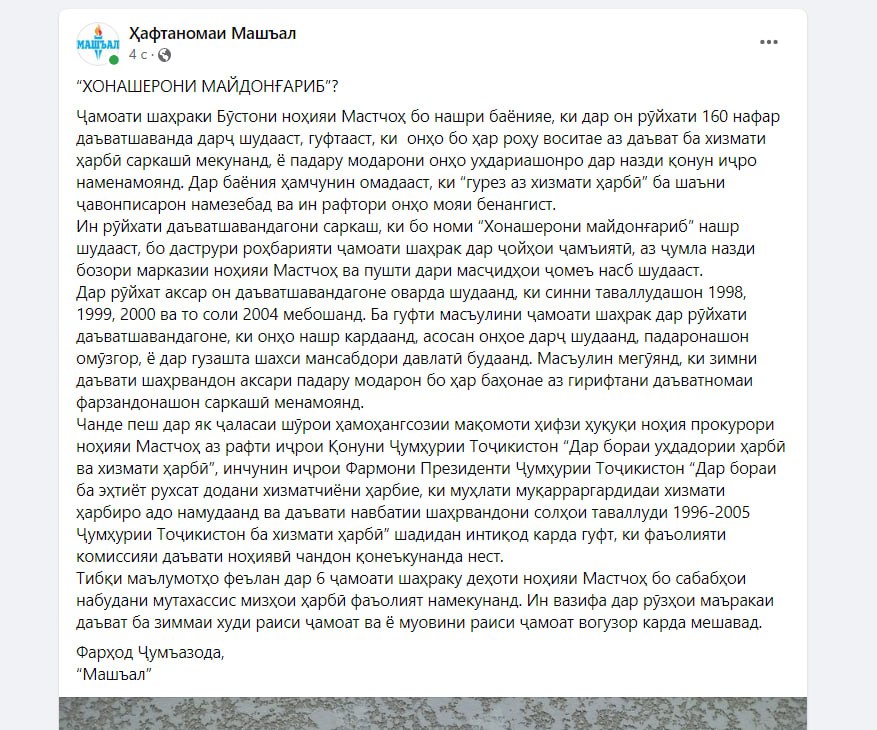 Местные власти джамоата Бустон Матчинского района Cогдийской области составили список 160 призывников, которые "любыми способами уклоняются от призыва на военную службу". В этот список в основном были включены те, чьи родители в прошлом были государственными чиновниками.