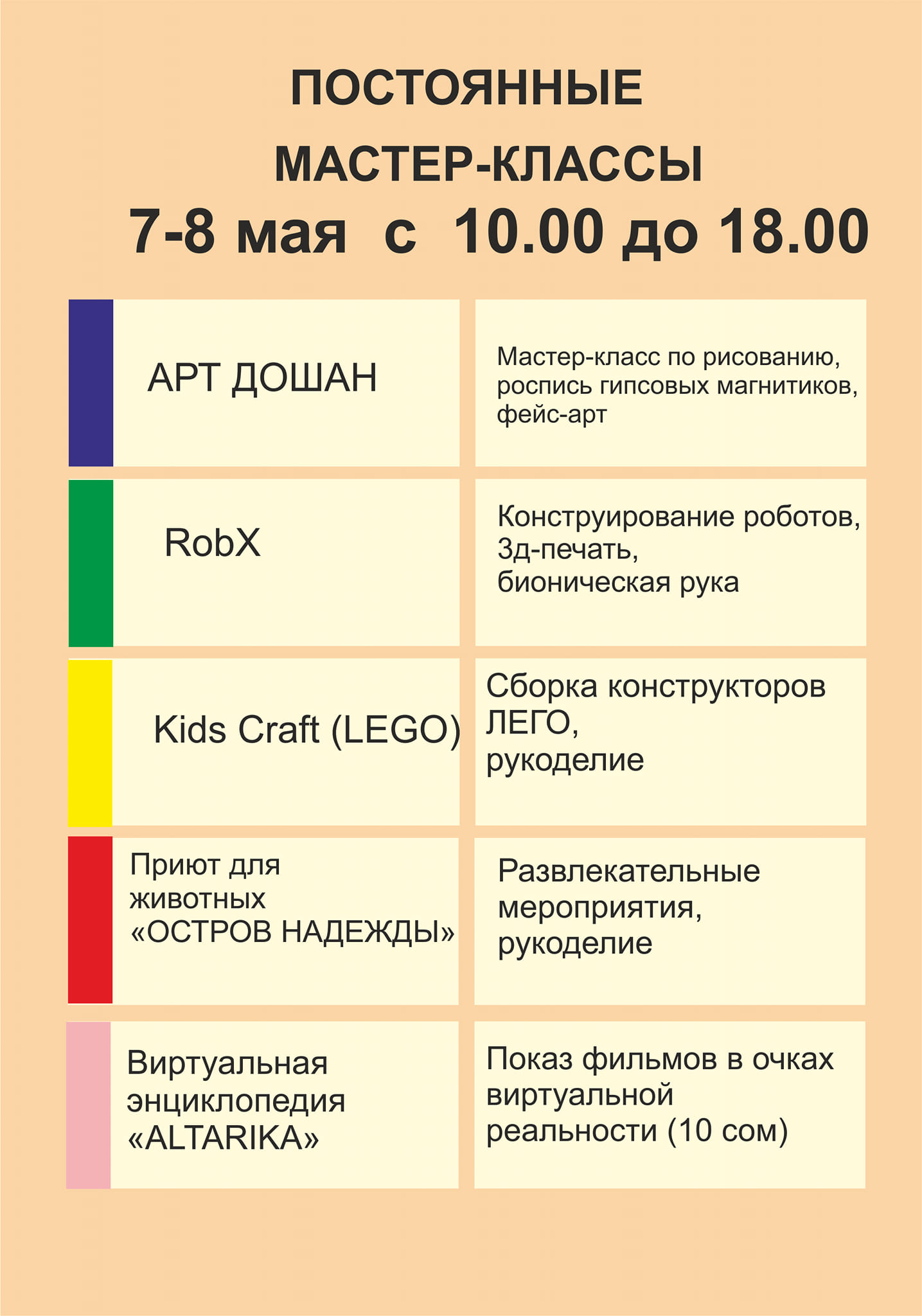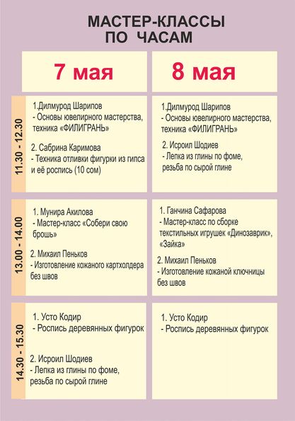 В рамках фестиваля пройдут несколько мастер-классов от таджикских мастеров: основы ювелирного дела и филиграни от Дилмурода Шарипова; лепка из глины и резьба по сырой глине от Исроила Шодиева; основы изготовления игрушек от Ганджины Сафаровой; роспись деревянных заготовок от Кодира Эгамова; изготовление карт-холдера и ключницы из натуральной кожи от Михаила Пенькова.
