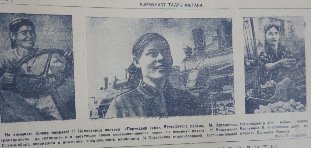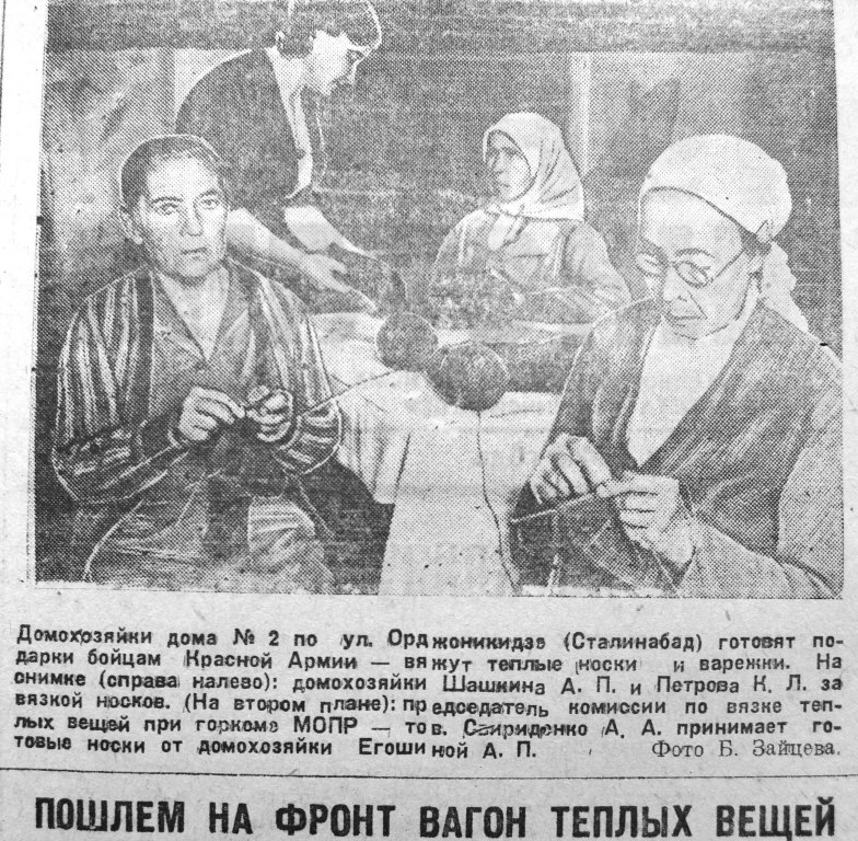 В ноябре 1941 года группа женщин душанбинских предприятий и домохозяек обратилась через газету ко всем женщинам Таджикистана с призывом: «Женщины! На производство, на самолеты, на тракторы, комбайны и автомобили!…Свободная советская женщина не может быть равнодушной, когда весь мир охвачен гневом и ненавистью к фашистским бандитам».