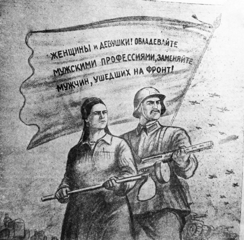 Более половины всех рабочих на предприятиях республики составляли женщины, 80% – на селе. Они работали под девизом: «Все для фронта – все для победы!».