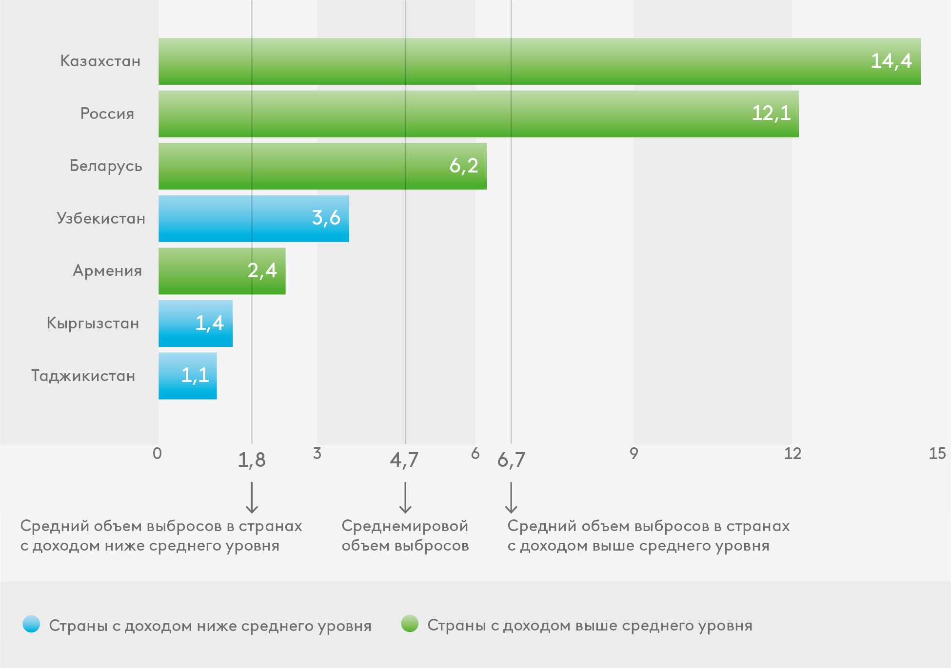 В публикации отмечается, что в Евразийском регионе (страны Евразийского экономического союза, Таджикистан и Узбекистан) наивысший показатель средневзвешенного по населению объема выбросов углекислого газа в тоннах на человека зафиксирован в Казахстане (14,4) и в России (12,1).