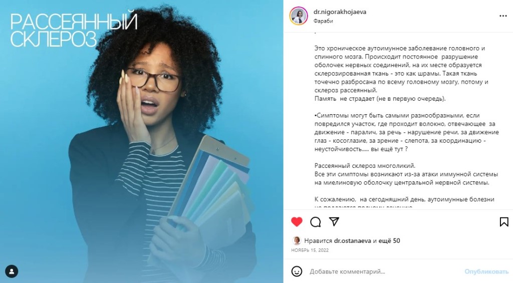 На ее странице можно узнать об аутоиммунных заболеваниях, лицевой боли, головокружении, черепно-мозговых травмах и не только. Также в каждом посте Нигора описывает симптомы заболевания и говорит, какие анализы нужно сдать.