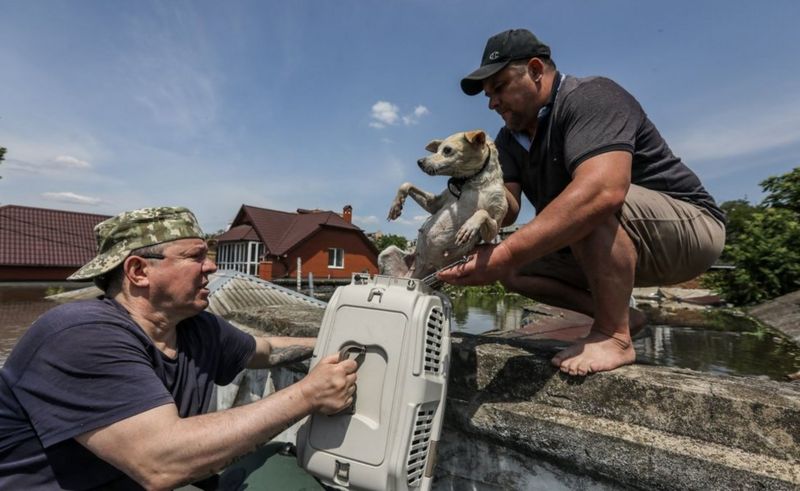 В ходе эвакуации люди пытаются вывезти и своих домашних животных. Относительно судьбы обитателей Каховского зоопарка поступает противоречивая информация: владелица зоопарка говорит, что многие из них утонули; оккупационные власти отрицают гибель животных.