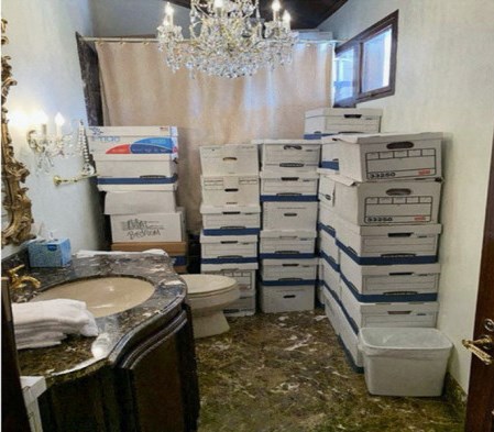 Как передает РБК, Трамп хранил свои коробки, содержащий секретные документы, в различных местах поместья Мар-а-Лаго, в том числе в бальном зале, ванной комнате и душе, туалете, служебном помещении, его спальне и кладовой. На одной из фотографий, опубликованных Минюстом США, видно, что коробки с секретными документами сложены рядом с унитазом.