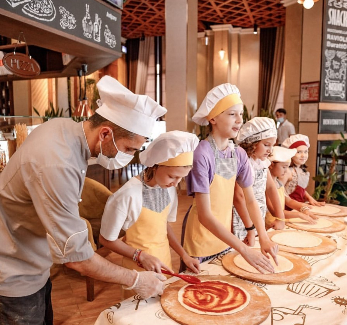 По выходным в заведении проводят мастер-классы для детей от 4-х лет — участие в них бесплатное. Здесь учат готовить традиционные итальянские и грузинские блюда или десерты, занимаются живописью и созданием поделок.