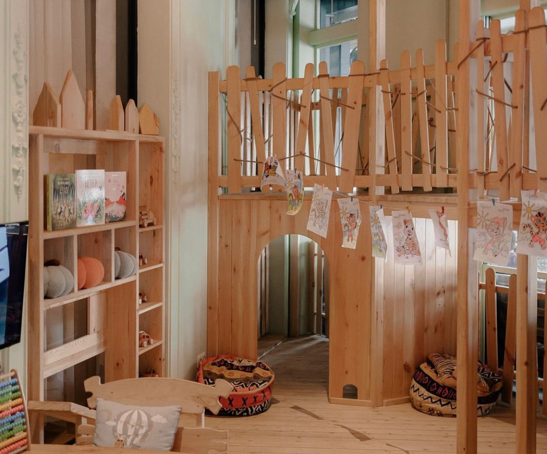 Ресторан итальянской и грузинской кухни и акцентом на семейный досуг. Детская комната в заведении обставлена в эко-стиле: нейтральная цветовая гамма, деревянные мебель, декор и игрушки.