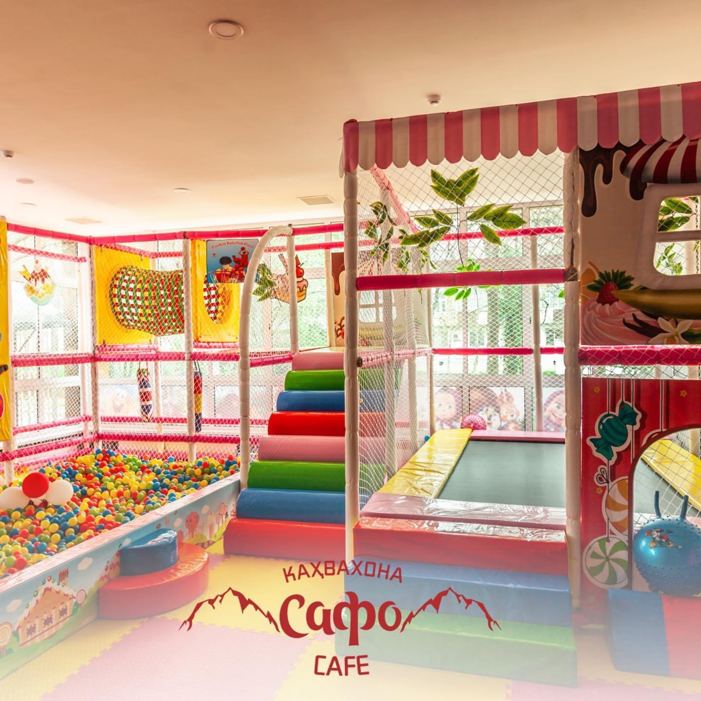 Она обставлена забавными игрушками, бассейном с шариками и батутами.