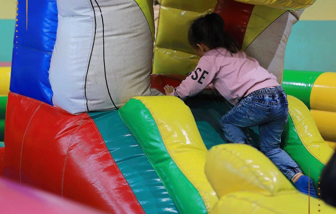 Дети здесь могут играть на надувном батуте и кататься на горке.