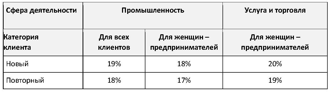 Согласно данной инициативе, кредиты которые направлены на развитие промышленности, поддержку отечественных предпринимателей, в особенности женщин-предпринимателей, предоставляются по следующим ставкам: