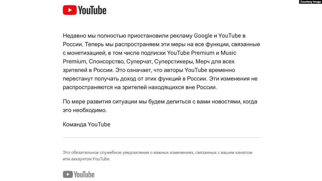 С начала марта видеохостинг YouTube полностью ограничил в Российской Федерации функции, связанные с возможностью монетизации, включая подписки YouTube Premium, Music Premium и прочие. Согласно информации, предоставленной компанией, это означает, что авторы временно лишаются возможности получать доход от указанных функций в России.