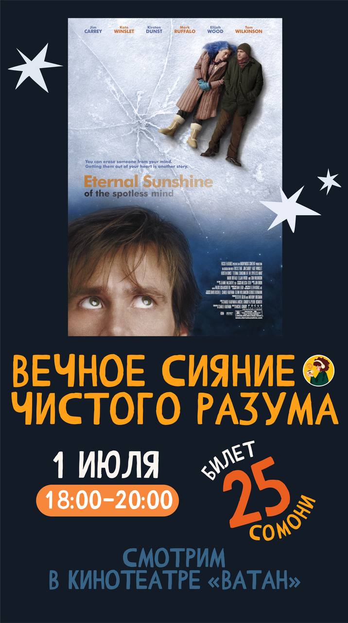 В столичном кинотеатре "Ватан" сегодня в 18:00 пройдёт очередная киновстреча от коворкинг-кафе "Monday" за просмотром фильма Мишеля Гондри "Вечное сияние чистого разума".