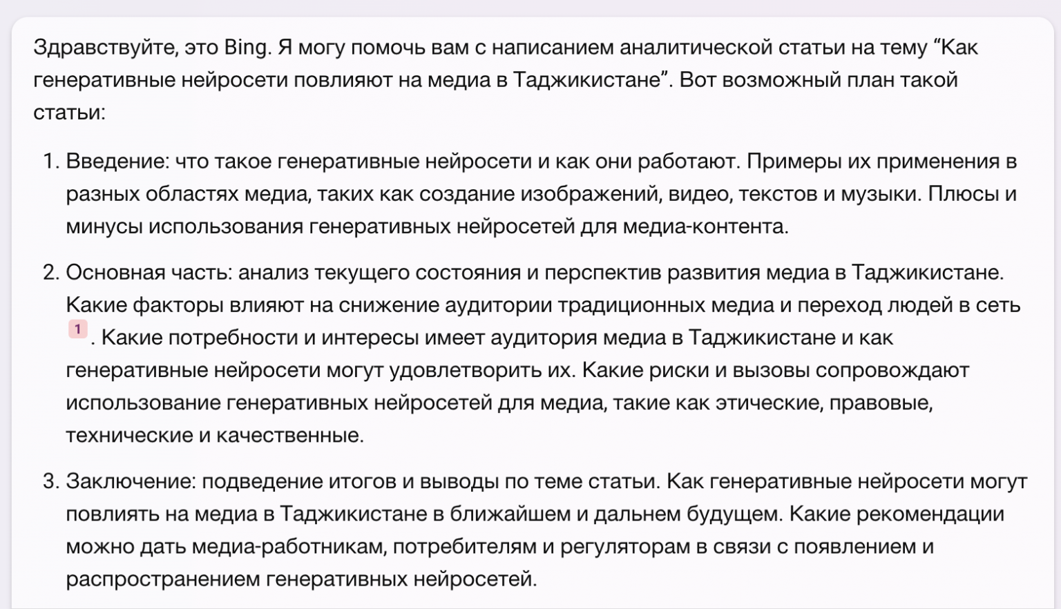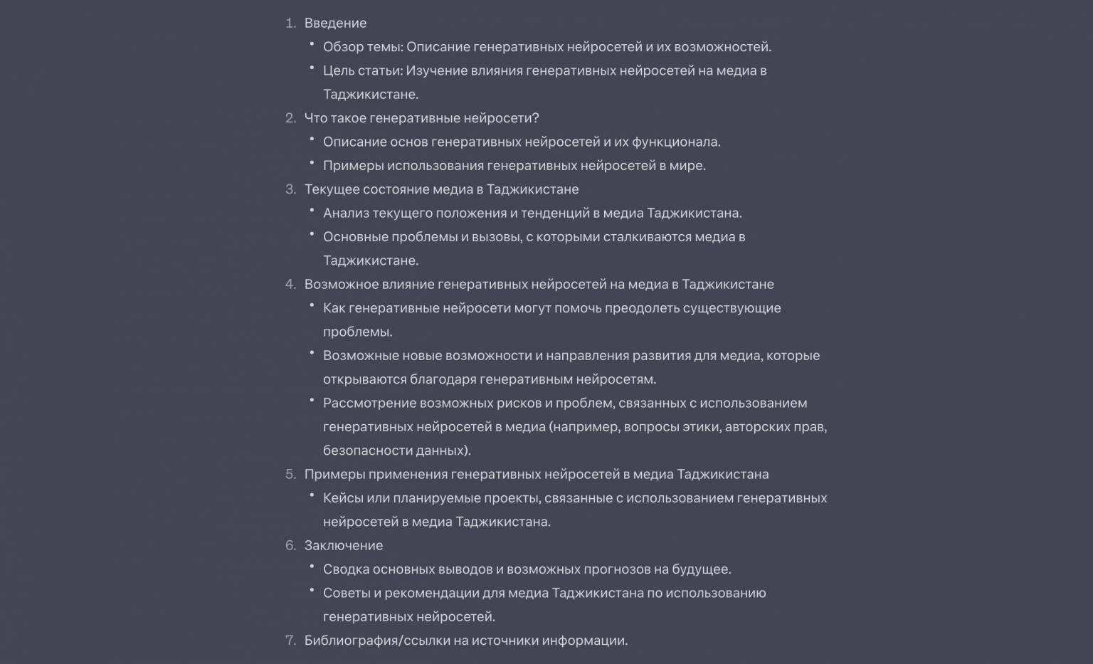 Чтобы изучить эффективность ИИ на практике, мы решили предложить трем нейтронным сетям разработать план аналитической статьи на тему «Как генеративные нейросети повлияют на медиа в Таджикистане».