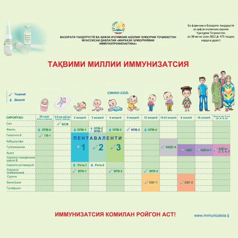 В Таджикистане иммунизация включает в себя 11 вакцин для детей, благодаря которым дети и взрослые защищены от 13 видов инфекций: гемофилии, гепатита В, дифтерии, коклюша, кори, краснухи, оспы, паротита, пневмококковой инфекции, полиомиелита, ротавируса, столбняка и туберкулёза.