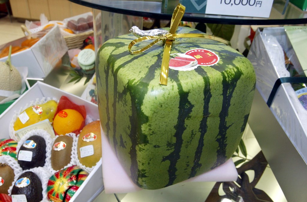 2. В Японии лет 30 назад вывели квадратные арбузы, точнее, кубовидные. Квадратный арбуз был впервые выведен в префектуре Кагава японского острова Сикоку.