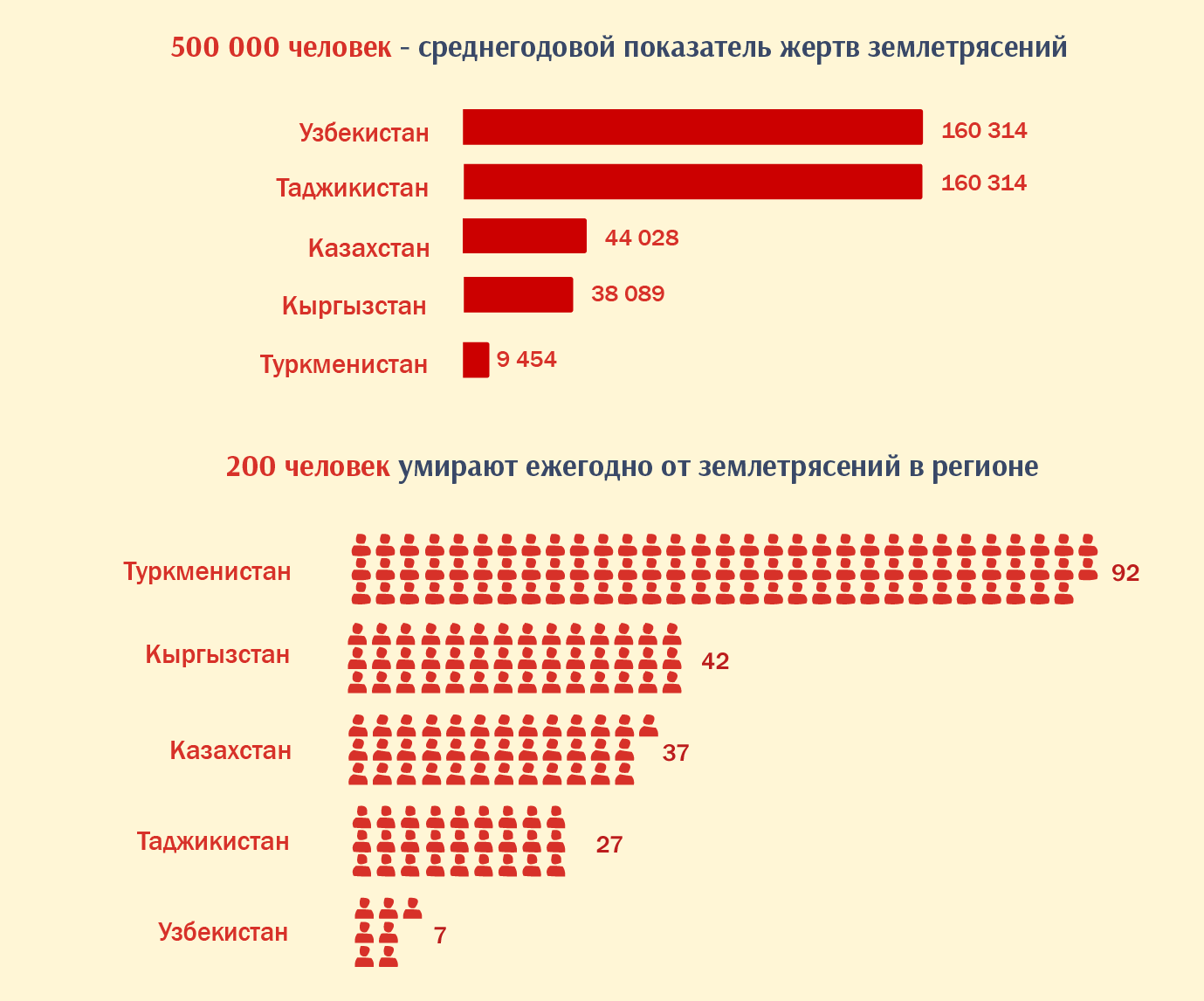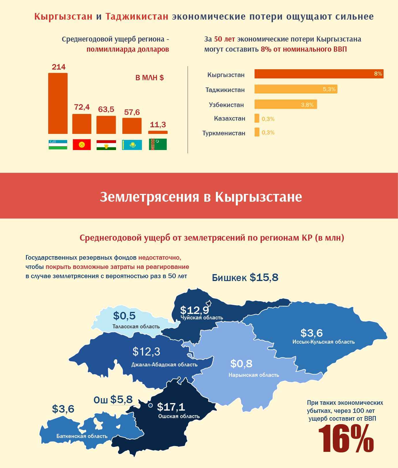 Страны с наименьшим ВВП, как Кыргызстан и Таджикистан, потери ощущают намного сильнее. Ежегодно только ущерб от землетрясений в Кыргызстане составляет $72 400 000. У государства нет возможности покрывать хотя бы половину потерь. Для предотвращения стихийных бедствий ежегодно из бюджета выделяется 400 млн сомов ($4,7 млн).