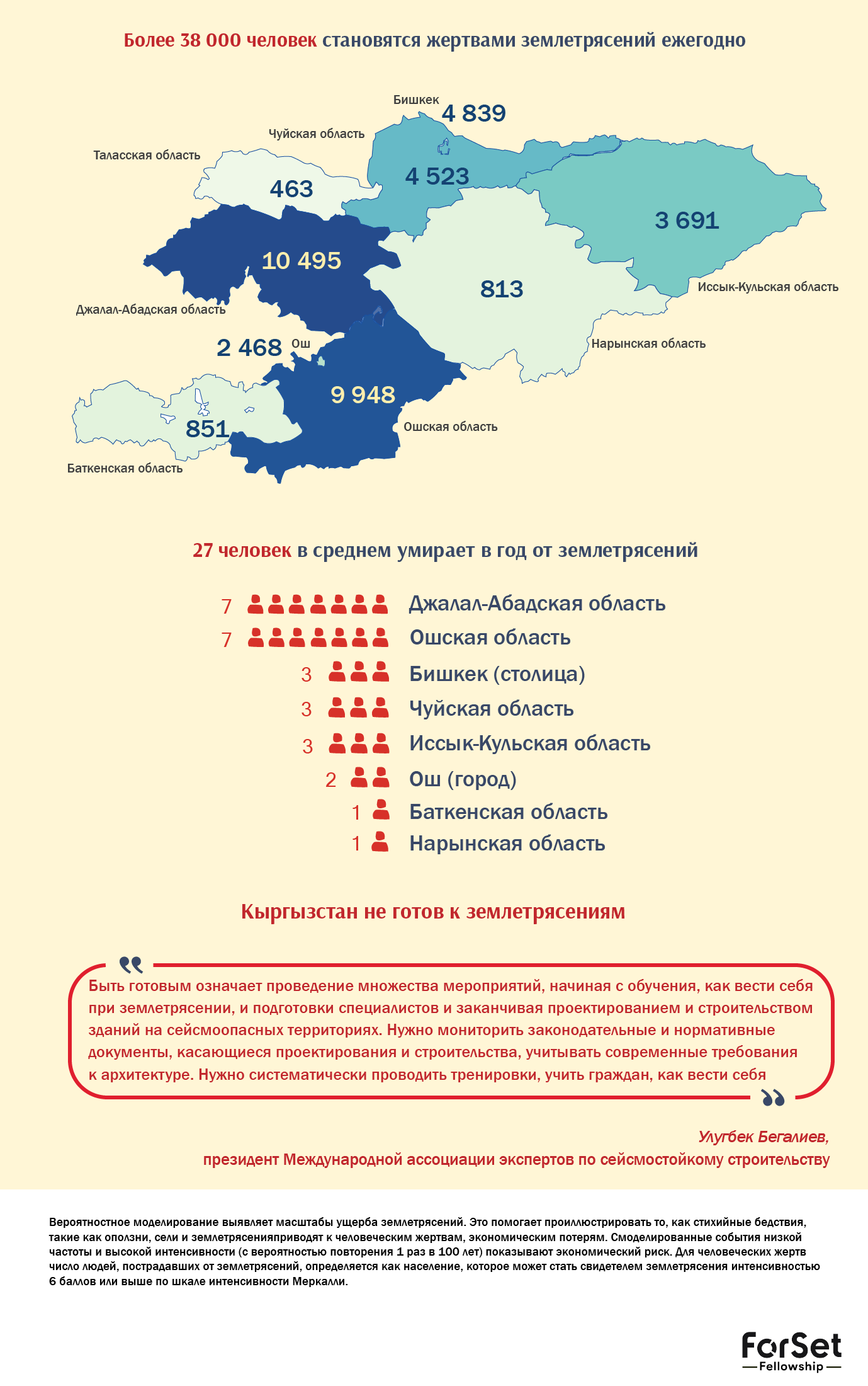 «В Кыргызстане землетрясения, как в Турции, происходят 1 раз в 3 000 — 5 000 лет. Силой 5-6 баллов — 1 раз в 50-60 лет. Неощутимые — около 300 раз в сутки», – президент НАН Канатбек Абдрахматов. (цитата по tazabek.kg)