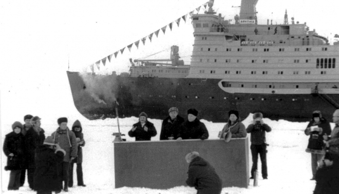 17 августа 1977 года советский атомный ледокол «Арктика» впервые в истории мореплавания достиг Северного полюса. Под командованием капитана Юрия Кучиева атомоход рано утром преодолев мощный трехметровый ледяной покров Центрального полярного бассейна, первым в мире достиг Северного полюса.