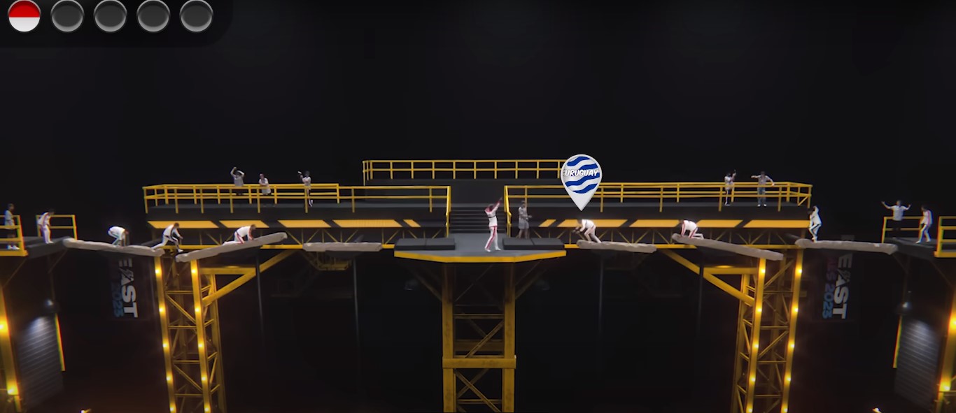 В первом этапе беге с препятствиями нужно было преодолеть большое расстояние с 3 барьерами за 30 секунд. Первым финишировал участник из Индонезии. По итогу, более половины стран-участниц выбыли. Дальше прошли лишь 97.