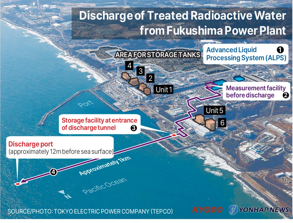 Очищенная вода будет сбрасываться в километре от берега через подводный тоннель. В сутки будет сбрасываться 460 т воды. Каждая тонна разбавляется 1,2 тыс. чистой морской воды. В первые 17 дней будет сбрасываться меньше 8 тонн воды. Сброс воды начался по плану — власти ранее на этой неделе анонсировали, что процесс будет запущен 24 августа при благоприятных погодных условиях.