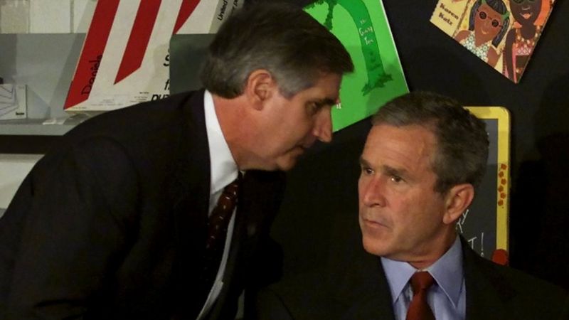 Буш все еще сидит перед первоклассниками. Глава администрации Белого дома Эндрю Кард шепчет ему на ухо новость о втором крушении самолета в башни-близнецы.