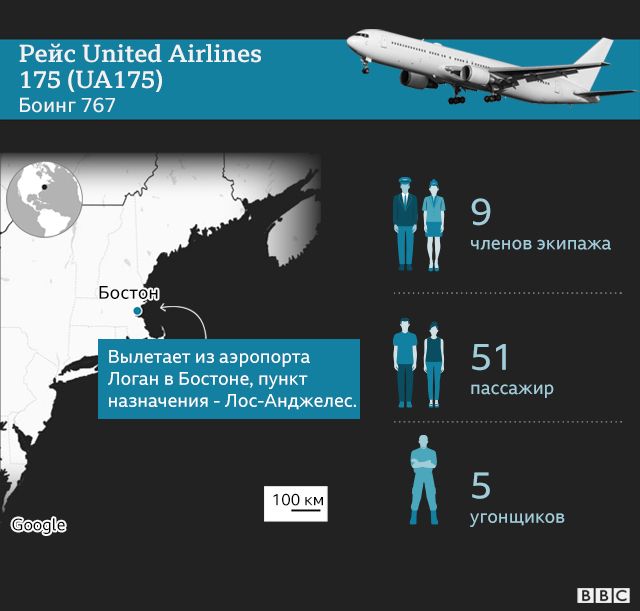 Из другого терминала того же аэропорта в Бостоне в Лос-Анджелес также вылетает рейс 175 United Airlines (UA175) с девятью членами экипажа и 56 пассажирами на борту.