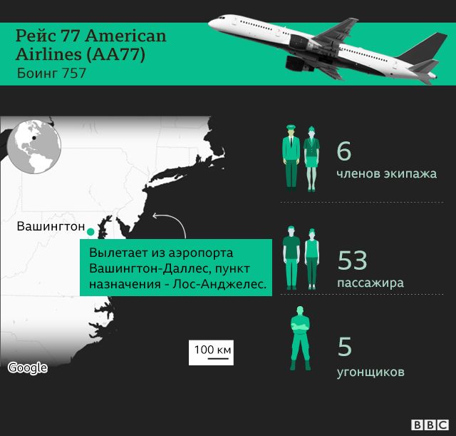 Рейс 77 (AA77) American Airlines вылетает из международного аэропорта Вашингтон-Даллес в Вашингтоне, округ Колумбия, с шестью членами экипажа и 58 пассажирами, включая пять угонщиков.