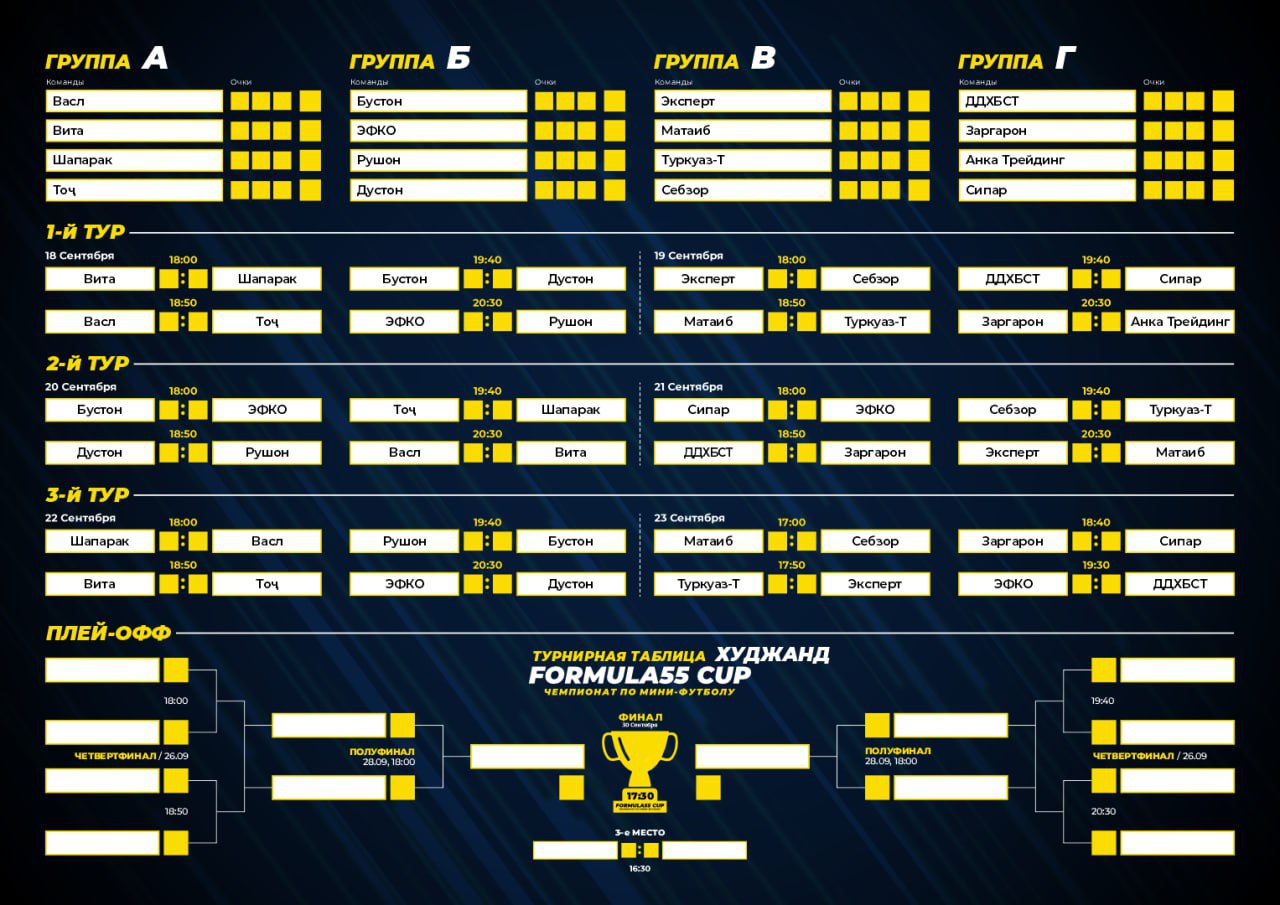 Жеребьёвка состоялась в пяти регионах Таджикистана, а сам Чемпионат будет проходить сразу в нескольких городах нашей страны — Худжанде, Бохтаре, Кулябе, Турсунзаде и Нуреке.