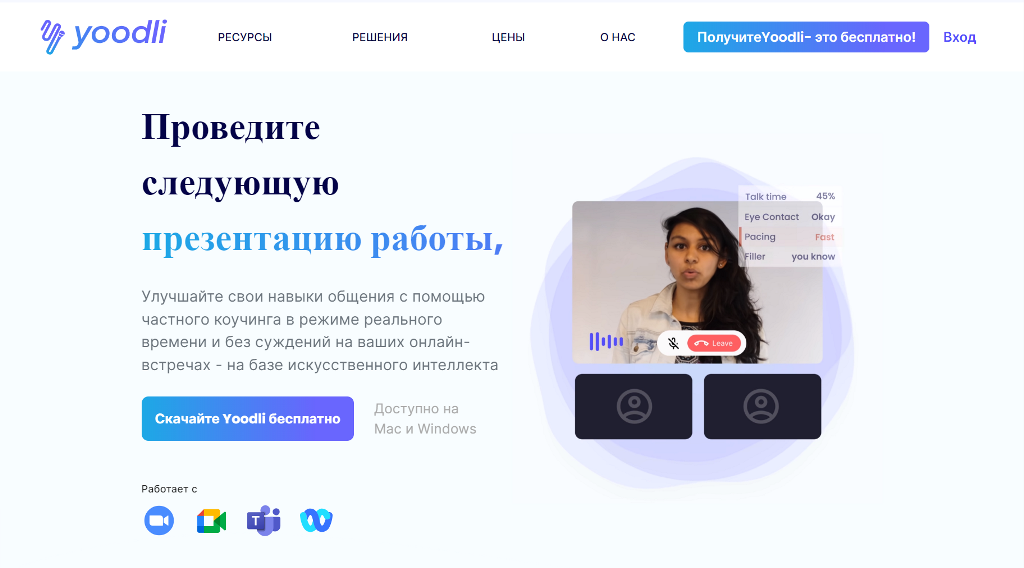 Платформа предоставляет аналитику визуальной, вербальной и вокальной подачи пользователя в режиме реального времени, а также обратную связь по его словам-наполнителям, темпу и выбору слов.