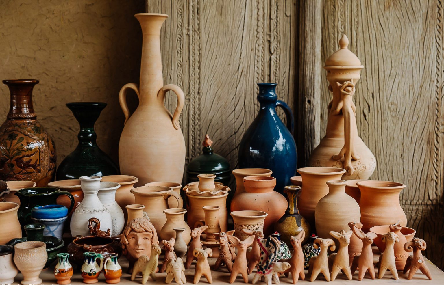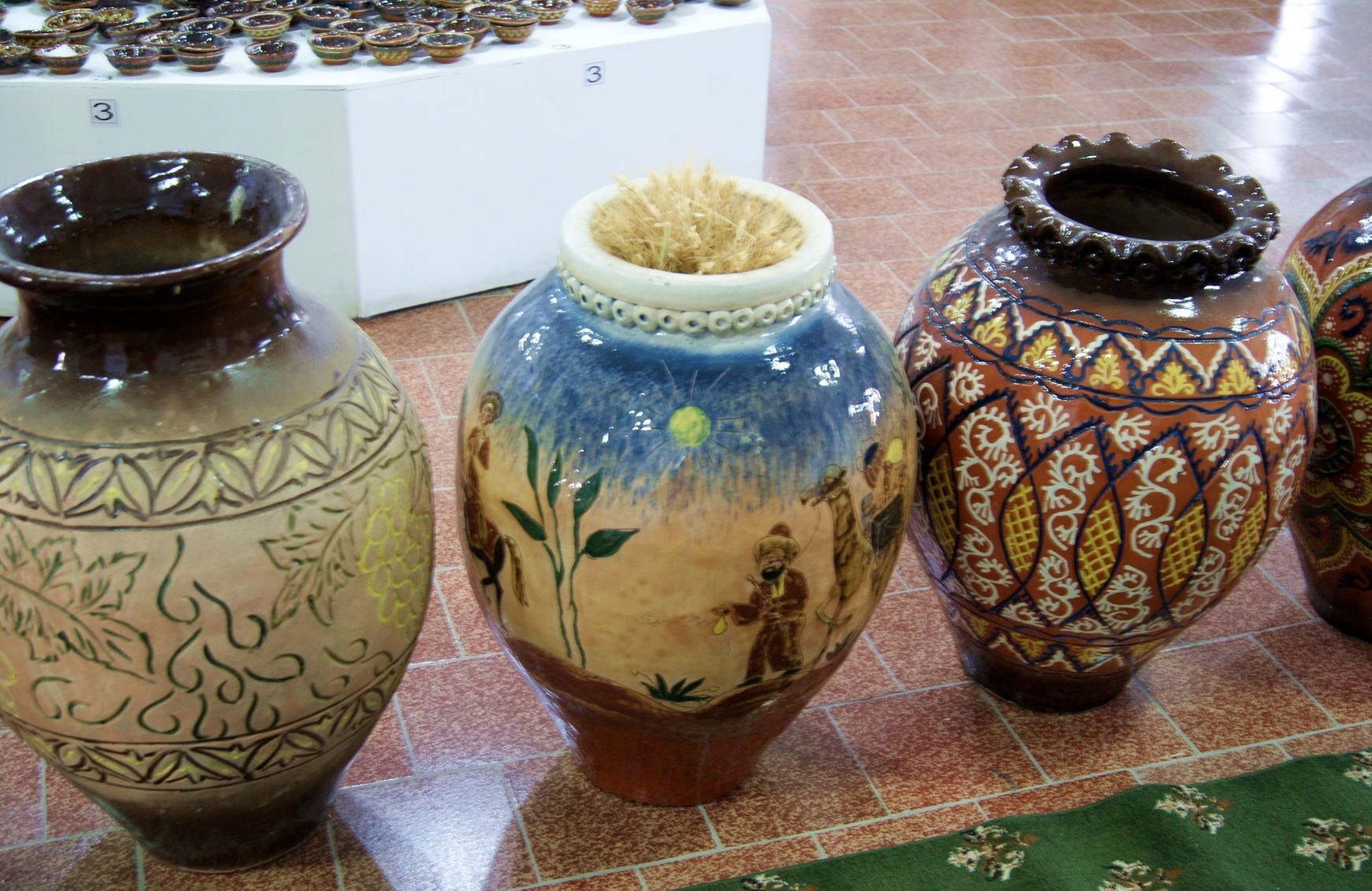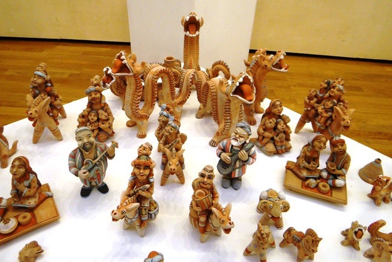 На экспозиции представлены изделия из сырца и обожженной глины, фрагменты древних языческих алтарей и керамические ящики-костницы – оссуарии, распространенные в доисламский период, и, конечно, посуда: кувшины, чаши и блюда.