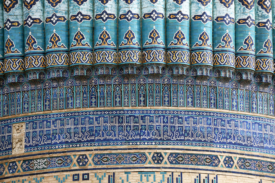 Усыпальницы в Шахи Зинда украшены бирюзовой, голубой, сине-кобальтовой плиткой с белыми, желтыми плоскими и каллиграфическими и растительными орнаментами.