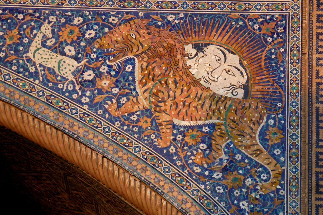 Наиболее необычно убранство медресе Шер-Дор из керамической мозаики: над стрельчатой аркой айвана мастер поместил парные зеркальные композиции, где солнца с человеческими лицами светят косматым тиграм, бегущим за антилопами.